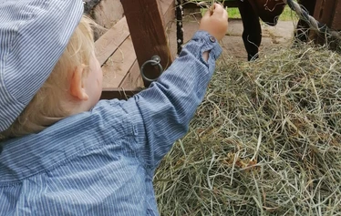 klo 11.45 karvainen kaveri ja traktorikyyti piknikpellolle (evästelypaikan äärellä hepoilua)