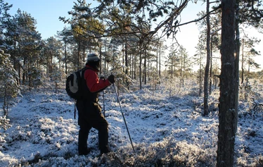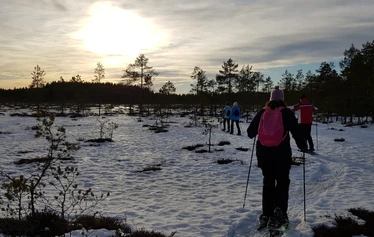 Lumikenkäilyä Isonevan soidensuolelualueella. Lumikenkäilemme rämeen poikki nevalle ja samalla tutustumme erilaisiin suotyyppeihin.